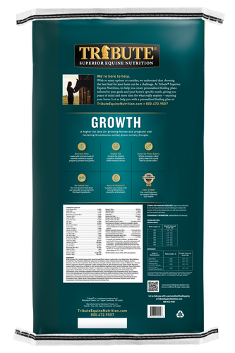 Growth Textured is a higher fat (8%) feed specially formulated for young, growing horses beginning at 3 months of age, as well as pregnant and lactating mares that require more calories in their diet. This highly palatable feed is packed with premium, essential nutrients to support proper bone, cartilage and tissue development, as well as pre- and probiotics to support digestive health. Growth Textured is ideal for horses consuming hay or pasture that is 50% or less alfalfa (or other legumes). If feeding hay or pasture that is 50% or more alfalfa, check out Alfa Growth®.